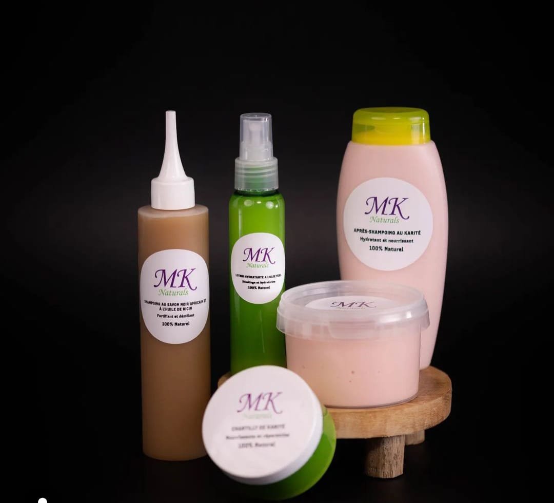 Les soins MK Naturals sont destinés à l’entretien des cheveux crépus, bouclés, frisés et secs. Ils sont à base de beurre de karité, savon noir et aloe vera.